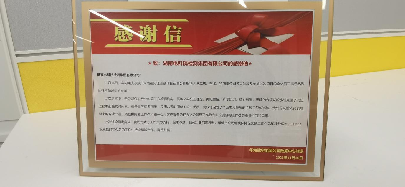 近日,我司收到華為數字能源公司發來的感謝信,對我司在華為電力模塊TüV南德見證測試項目中做出的突出貢獻給予充分肯定和衷心感謝。
